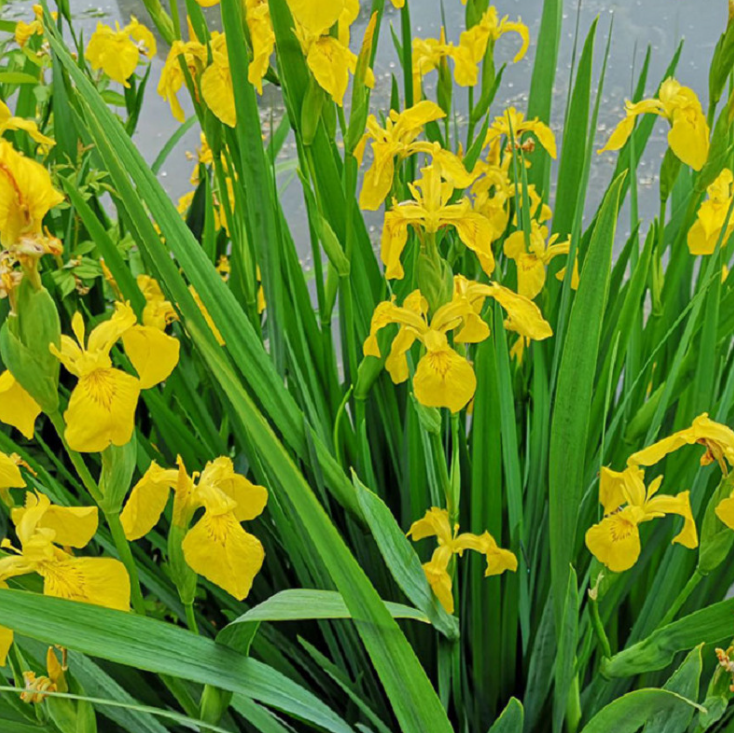 黄菖蒲(学名:Iris pseudacorus L.)是鸢尾科鸢尾属植物,是多年生湿生或挺水宿根草本植物,植株高大,根茎短粗。叶子茂密,基生,绿色,长剑形,长60-100厘米,中肋明显,并具横向网状脉。花茎稍高出于叶,垂瓣上部长椭圆形,基部近等宽,具褐色斑纹或无,旗瓣淡黄色,花径8厘米。蒴果长形,内有种子多数,种子褐色,有棱角。花期5-6月份。黄菖蒲适应范围广泛,可在水边或露地栽培,又可在水中挺水栽培,是少有的水生和陆生兼备的花卉,水生花卉中的骄子,观赏价值较高。