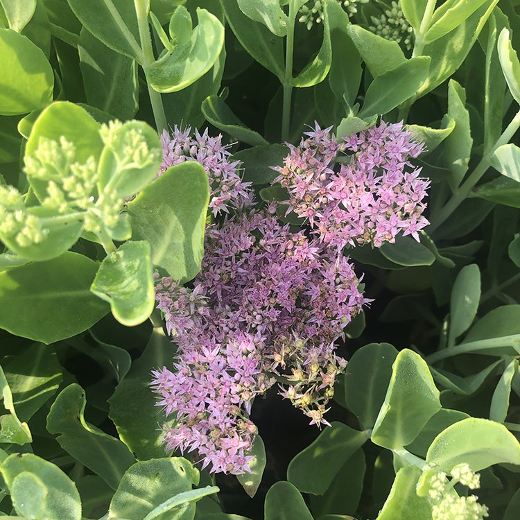 多年生肉质草本植物,株高30~50cm。地下茎肥厚,地上茎簇生,粗壮而直立,全株略被白粉,呈灰绿色。叶轮生或对生,倒卵形,肉质,具波状齿。伞房花序密集如平头状,花序径10~13cm,花淡粉红色,常见栽培的尚有白色、紫红色、玫红色品种。 花期,7~10月。