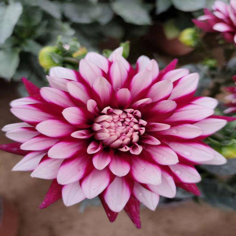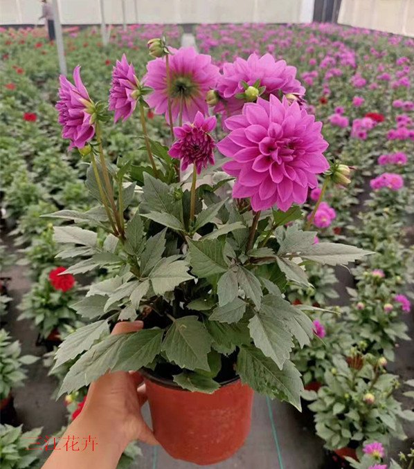 大丽花(Dahlia pinnata Cav.),别名大理花、天竺牡丹、东洋菊、大丽菊、地瓜花,菊科、大丽花属植物,多年生草本,有巨大棒状块根。茎直立,多分枝,高1.5-2米,粗壮。原产于墨西哥,墨西哥人把它视为大方、富丽的象征,因此将它尊为国花。大丽花之所以被称为世界名花之一,主要是因为它的花期长、花径大、花朵多。在北方地区,花期从5月至11月中旬,在温度适宜条件下可周年开花不断,以秋后开花最盛。精品大丽花最大花径可达到30~40cm,是花卉中独一无二的。花色有红、紫、白、黄、橙、墨、复色七大色系,花朵有单瓣和重瓣,单瓣花朵开放时间短些,重瓣花朵开放时间较长。花朵特征与瓣形变化是品种鉴定的主要依据,有球型、菊花型、牡丹型、装饰型、碟型、盘型、绣球型和芍药型等花型的品种群体,以色彩瑰丽,花朵优美而闻名。因此大丽花适宜花坛、花径或庭前丛植,矮生品种可作盆栽。